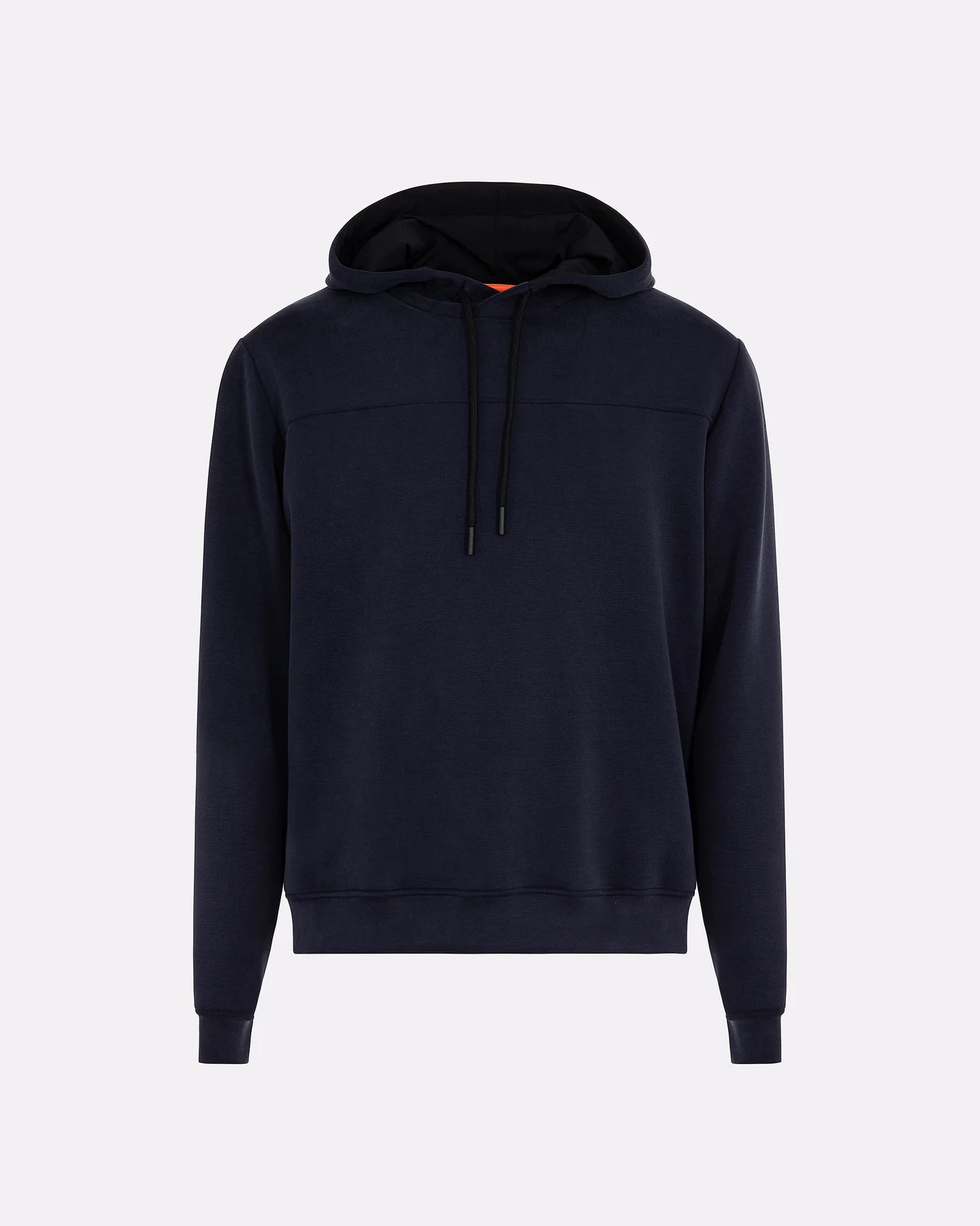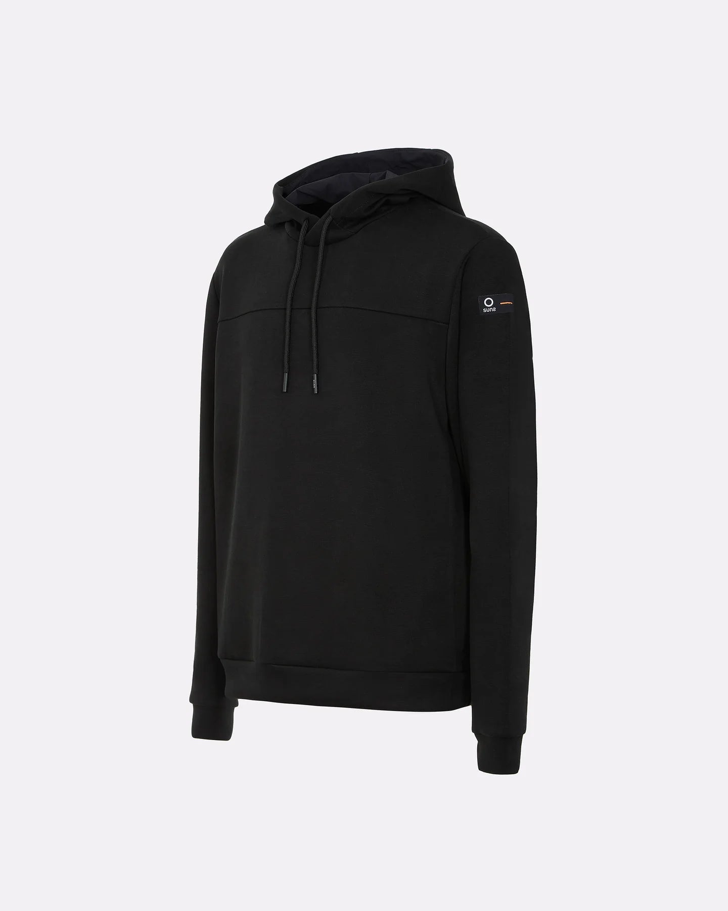 Una felpa con cappuccio da uomo dal look pulito e curato nei dettagli, realizzata in jersey tecnico fluido che offre morbidezza, comfort ed elasticità. Il cappuccio è foderato in nylon nero e completato da una coulisse tono su tonocon capsula logata Suns, mentre il taglio carrè frontale aggiunge un tocco dinamico al design essenziale. Il dettaglio arancio fluo del parasudore interno e la pinnetta arancione in silicone sul fianco donano al capo un’identità distintiva.